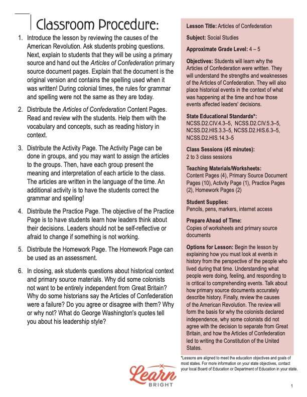ARTICLES OF CONFEDERATION LESSON PLAN CONTENT PAGES